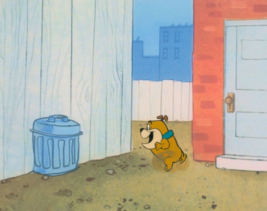 A production cel from the Hanna Barbera Studios animated series "Top Cat" (1961-present). Featuring Griswald the police dog, the hand-painted cel was created at the studio and used during the animation process. The piece is an actual frame of animation that was photographed and appears in the episode entitled "Griswald," which aired on April 11, 1962. Measuring 10.5"x12.5" overall, with the character image measuring 2.75"x2", the cel is in very good condition with minor surface and line wear throughout. The cel has been paired with a color copy reproduction background.